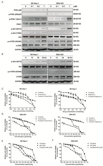 Effect of ponatinib on the protein kinase B (Akt)/mechanistic target of rapamycin (mTOR) signaling pathway. (A) Effects of ponatinib on the protein concentration and phosphorylation of PI 3-kinase, PDK1, Akt, and mTOR. (B) Time course of ponatinib (1 μM) effect on the phosphorylation of Akt and mTOR. (C) Effect of ponatinib on SK-Hep-1 cell viability in the presence and absence of mTOR inhibitors, temsirolimus and rapamycin. (D) Effect of ponatinib on SNU-423 cell viability in the presence and absence of mTOR inhibitors, temsirolimus and rapamycin. (E) Effect of ponatinib on SK-Hep-1 cell viability in the presence and absence of an Akt inhibitor, MK-2206. (F) Effect of ponatinib on SNU-423 cell viability in the presence and absence of an Akt inhibitor, MK-2206.