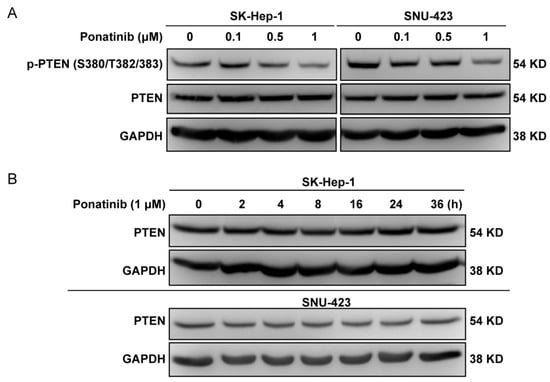 Effect of ponatinib on PTEN. (A) Effect of ponatinib on the phosphorylation of PTEN on Ser380/Thr382/383. For the Western blot analysis, SK-Hep-1 and SNU-423 cells were treated with ponatinib at indicated concentrations for 36 h. (B) Time course of ponatinib (1 μM) effect on PTEN in SK-Hep-1 and SNU-423 cells.