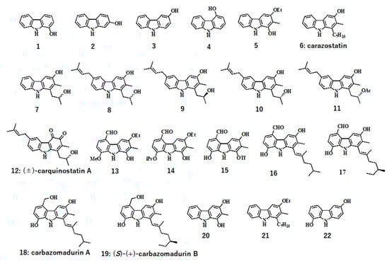 Carbazole derivatives were provided as follow; Compounds 2 (2-hydoxycaebazole: No. 322-55321) and 4 (4-hydroxycarbazole: No. H1014) were purchased from FUJIFILM Wako Pure Chemical Corp. (Tokyo, Japan) and Tokyo Chemical Ind. Co., Ltd., (Tokyo, Japan), respectively. Compounds 1, 3, 5, 6 (carazostatin), 20, 21, and 22 were synthesized by the method previously reported [6,37]. Compound 7 was synthesized by the method previously reported [38]. Compounds 8, 9, 10, 11, and 12 ((±)carquinostatin A) were synthesized by the method previously reported [3]. Compounds 13, 14, 15, 16, 17, 18 (carbazomadurin A), and 19 ((S)-(+)-carbazomadurin B) were synthesized as reported earlier [4].