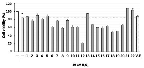 Effects of carbazole derivatives on neuro2a cell viability. Neuro2a cells pretreated with test compounds (compounds 1–22 at the concentration of 10 µM or with vitamin E [V.E] at the concentration of 50 µM) were exposed to 30 µM H2O2. The results represent the mean ± SEM (n = 5, different culture). Significance difference in values between the none-treated and H2O2-treated cells: * p < 0.05 (Student’s t test).