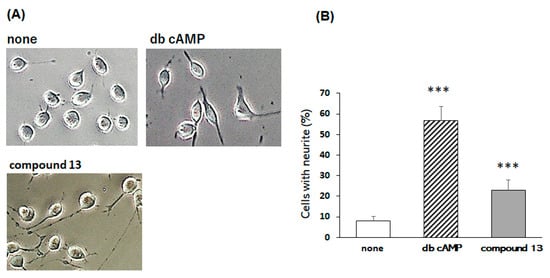 Effects of compounds 13 and dibutyryl cAMP (db cAMP) on neurite outgrowth from neuro2a cells. Neuro2a cells were treated with test compounds (5 mM db cAMP or 0.5 µM compound 13) for 48 h, and then morphological images were captured by phase-contrast microscopy (A). Cells were randomly chosen for counting neurite-bearing cells (n = more than 100 cells per group) (B). Significance difference in values between the sample-treated and non-treated cells: *** p < 0.001 (one-way ANOVA followed by the Dunnett’s multiple comparison test).