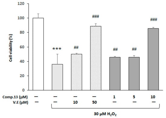 Effects of compound 13 and vitamin E on neuro2a cell viability. Neuro2a cells pretreated with test compounds (compound 13 at the concentration of 1–10 µM or vitamin E at the concentration of 10–50 µM) were exposed to 30 µM H2O2. The results represent the mean ± SEM (n = 5, different culture). Symbols are significantly different for the following condition; vs. none-treated cells (*** p < 0.001, Student’s t test), vs. 30 µM H2O2-treated cells (## p < 0.01, ### p < 0.001, one-way ANOVA followed by the Dunnett’s multiple comparison test).