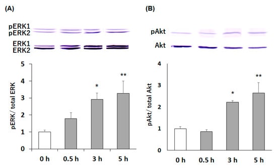 Next, we characterized the cell signaling pathway functioning in the compound 13-induced neurite outgrowth. Over the past 2 decades, numerous studies have revealed the molecular mechanisms underlying the regulation of neurite outgrowth by various factors. The representative pathway for neurite outgrowth is the activation of the PI3K/Akt and/or protein kinase A (PKA)/mitogen-activated protein kinase (MAPK)/ERK signaling pathways [16,17,18,19,20,21]. We thus tested by immunoblot analysis whether compound 13 had the ability to promote the phosphorylation of ERK1/2 and/or Akt in neuro2a cells. For this experiment, cells seeded in 6-well plates were maintained in a normal-serum medium for 24 h and then in a low-serum medium for 24 h. Thereafter, the cells were kept for 0.5–5 h in a low-serum medium containing 30 µM compound 13.