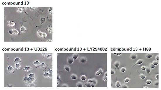 These results revealed that compound 13 had the ability to induce the phosphorylation of both ERK1/2 and Akt. In order to confirm whether compound 13 induced neurite outgrowth through MAPK/ERK and/or PI3K/Akt signaling pathways, we preincubated the cells for 30 min with specific inhibitors of ERK1/2 (10 µM U0126), PI3K (10 µM LY294002) or PKA (1 µM H89) and then incubated them with compound 13 for 48 h. These inhibitors themselves had no effect on the formation of neurites (data not shown). Figure 6 shows that the blockade of PI3K by LY294002 and the blockade of PKA by H89 reduced the neurite-promoting effect of compound 13. On the other hand, the blockade of MAPK/ERK by U0126 scarcely affected the formation of neurites. These results suggest that compound 13-induced neurite outgrowth from neuro2a cells was being regulated through the PI3K/Akt-mediated signaling pathway and not the PKA/MAPK/ERK one. Other various signal pathways such as c-jun N-terminal kinase (JNK) have been reported to be involved in neurite outgrowth of neuro2a cells [19,21]. We will investigate whether not only PI3K/Akt-mediated signaling pathway, but also other signaling pathway(s) underlie the compound 13-induced neuronal differentiation or not.