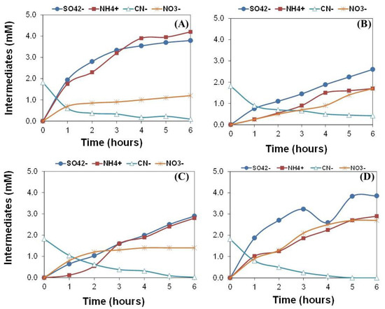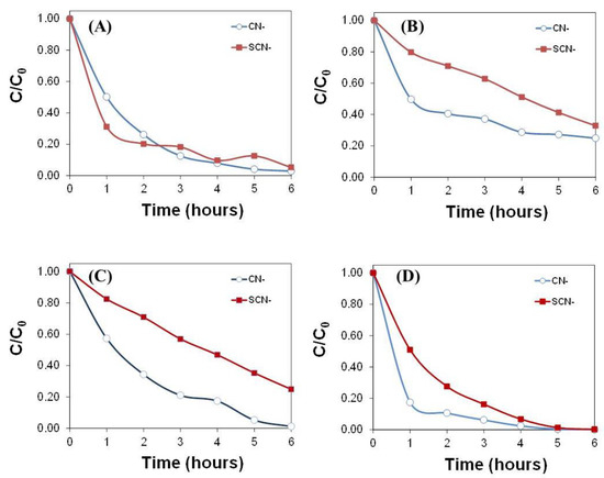 Cyanides and thiocyanates are formed in several industrial processes such as gold mining activities and the production of coke in steel factories. Both pose major environmental and health concerns as they can be generated in high concentrations in industrial effluents [1,2]. For instance, typical consumptions of cyanide in cyanidation plants are ca. 100 times higher than the stoichiometric amounts due to the large losses associated to the formation of volatile HCN, cyanide metallic complexes (copper, iron), and thiocyanates. Thus, the concentrations of cyanides and thiocyanates in mill effluents in gold mining activities can vary considerably between 40 to 600 mg/L [3]. In cokemaking factories, thiocyanate is one of the major constituents of wastewater with concentrations in the range of 20–1500 mg/L. Thiocyanate can also be formed biologically from the detoxification of cyanides [3]. Furthermore, although thiocyanate is less toxic than cyanide, it is more stable and thus more difficult to degrade.
