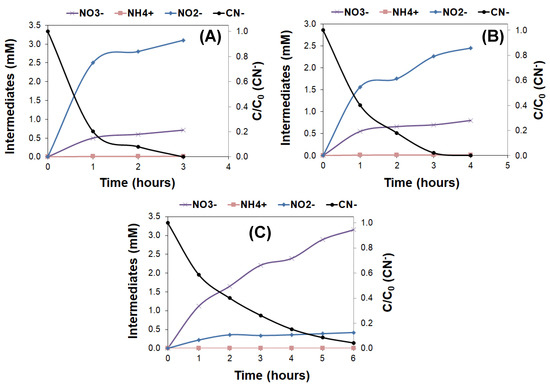 Evolution of the concentration of cyanides (left axis) and intermediates (right axis) upon illumination of a synthetic solution of 100 mg/L of KCN with various light sources. (A) UVC lamp; (B) UV-Vis lamp; (C) SimSolar lamp.
