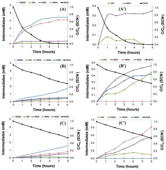 Evolution of the concentration of thiocyanates (right axis) and intermediates (left axis) upon illumination of a synthetic solution of 200 mg/L of potassium thiocyanate with various light sources. (A,A’) UVC lamp; (B,B’) UV-Vis lamp; (C,C’) SimSolar lamp (for clarity, plots A, B, and C are magnified in A’, B’, and C’, respectively).