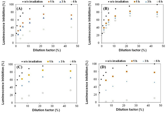 Luminescence inhibition of V. fischeri after exposure to cokemaking wastewater before (w/o irradiation) and after the photochemical treatments during 1, 3, and 6 h of irradiation using: (A) UVC lamp; (B) UV-Vis lamp; (C) SimSolar lamp; (D) SimSolar lamp and TiO2 as photocatalyst.