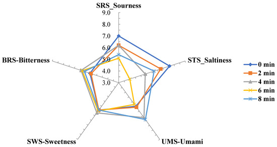 E-tongue analysis was performed to investigate chemical measures associated with the sensory characteristics of P. frutescens Britton during the roasting process. The e-tongue analysis result is shown in Figure 1. The relative taste comparison of P. frutescens Britton during the roasting showed that umami and bitterness increased whereas sourness and saltiness decreased. Sweetness remained unchanged. These results can be explained in relation to the constituent and free amino acids compositions explained in the previous section of this study. Increase of umami taste may be associated with the increase of glutamic acid and that of bitterness would be related to the increase of leucine, phenylalanine, and valine as shown in Table 3 and Table 4. Although the amino acids eliciting sweet tastes including alanine and glycine increased, sweetness analyzed by e-tongue did not show a marked change over time. In case of sourness, aspartic acid inducing sour taste increased but corresponding sourness by e-tongue decreased. Such a discrepancy is probably because amino acids are not the sole factors of taste development but many other components including sugars, fatty acids, and volatile compounds participate complexely in taste development [27]. Recently, e-tongues have widely utilized to objectively measure tastes in many studies, such as investigation of the taste properties of fermented soybeans with mycelia of Tricholoma matsutake and Bacillus sp. [28], analysis of chemical compounds that may affect sensory properties of different parts of Wasabi koreana Nakai [30], discrimination of geographical origins of red ginseng [31], and investigation of the sensory properties of commercial seasonings [32].