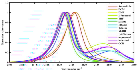 There was one NC stretching peak when 5ICI was dissolved in aprotic solvents, such as THF, toluene, DMSO, DMF, CCl4, and 1,4-dioxane. However, there were two stretching peaks when 5ICI was dissolved in the alcohols. Qualitatively, the lower frequency peak and relatively weaker blue-shifted peak in the alcohols could be attributed to the non-H-bonded and H-bonded NC groups [30]. We will discuss the NC stretching mode of the non-H-bonded NC group in the following. The NC stretching frequency of non-H-bonded 5ICI was shifted by approximately 7 cm−1 from n-octanol to DCM (Table 1). The polarizability of a solvent can induce a local electric field in the NC stretching mode, and this will shift the stretching frequency. There was a shift in the NC stretching frequency of approximately 5 cm−1 when the solvent was changed from toluene to DCM, which could result in a decrease in π*, and there was almost no change for the other parameters. Therefore, we could attribute this shift to the change in π*. The HBD ability of the solvent was also shown to play an important role in the NC stretching frequency. For example, a shift of approximately 2 cm−1 for the NC stretching frequency was observed when the solvent was changed from THF to MeOH. These two solvents exhibited similar π* and β values, but their α values were quite different. These results suggest that the NC stretching frequency is sensitive to the HBD ability of the solvents.