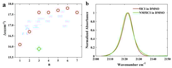 (a) The peak separation between the NC stretching frequencies of non-H-bonded and H-bonded NC groups in alcohol solutions versus the carbon chain length (n) of the alcohols. (b) Comparison of the NC stretching mode of 5ICI and NM5ICI in DMSO.