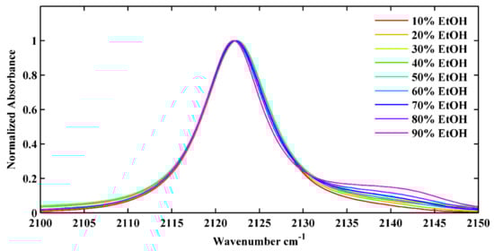 Finally, we will discuss the relatively weaker blue-shifted peak in the alcohols which were qualitatively attributed to the NC stretching mode of the H-bonded NC group. To further validate this argument, we performed static IR spectroscopy of NM5ICI in binary solvents with various ratios of DMSO and EtOH. We chose NM5ICI instead of 5ICI to eliminate the possible complexity induced by the H-bonding between the solvents and pyrrole N–H group in the indole ring. We chose DMSO because it is a strong HBA but not an HBD solvent. We chose EtOH since it is both a strong HBD and HBA and the solute can hardly dissolve in water. As shown in Figure 6, the lower-frequency NC stretching mode shifted from 2121.9 cm−1 to 2121.5 cm−1, and the intensity of the relatively weaker blue-shifted peak increased when the ratio of EtOH was increased from 10% to 90%. This result confirmed that the relatively weaker blue-shifted peak in the alcohols could be attributed to the NC stretching mode of the H-bonded NC group. We also investigated the dependence between the NC stretching frequency of the H-bonded NC group and their associated solvent Kamlet–Taft parameters, but no linear correlation was found (Figure S5). There was also no linear correlation between the NC stretching frequency of the H-bonded NC group and the density of the HBD for the NC group (Figure S6).