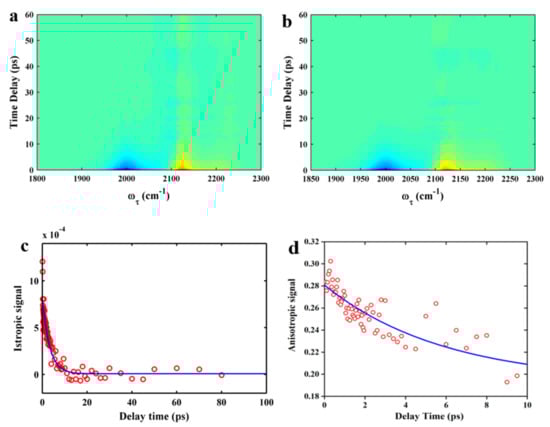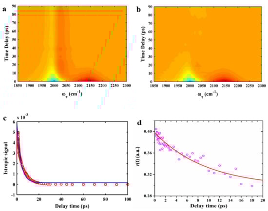 Time- and frequency-resolved isotropic IR pump–probe signals for 5ICI in DMSO before (a) and after (b) subtraction of the heat contribution. (c) Population decay of 5ICI in DMSO. The signal can be fitted to a single exponential function (blue line). (d) Anisotropy decays of 5ICI in DMSO. The signal can be fitted to a single exponential function (red line).