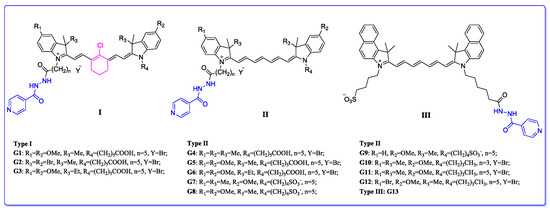 As illustrated in Scheme 2, symmetric heptamethine cyanine dye intermediate 6 was synthesized by one-step base-catalyzed (Et3N) aldol reaction of intermediates 1 and 2. However, asymmetric heptamethine cyanine dye intermediate 6 was afforded by the two-step aldol condensation reaction of intermediates 1, 2, and 5 in Ac2O with pyridine as catalyst. Finally, the desired compounds G4–G12 were generated by the coupling of 6 with INH in anhydrous DCM with DCC and DMAP acting as coupling agents. Meanwhile, the type III compound G13 was obtained in the sequence of steps outlined in Scheme 3.