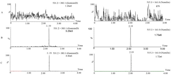 ESI positive and negative modes were both compared and evaluated in method development [24,25,26]. In this work, the response of the positive ion mode showed a better signal-to-noise ratio than that of the negative ion mode. The most abundant fragment ions for MRM was m/z 531.2 → 383.1 and m/z 515.3 → 161.0 for gomisin D and IS. The ionic response intensity of m/z 531.2 → 383.1 was five times higher than that of 531.2 → 401.1 reported in literature [19,22]. In the optimization of UPLC conditions, we found that the mobile phases had an important role in obtaining good chromatographic performances. Acetonitrile and 0.1% formic acid were selected as the mobile phases because they provided sharper peak shapes and shorter retention time. The retention time of 2.29 min was much shorter than that of >11 min reported in literature [19,22]. To find a proper IS, several compounds, including eupatilin, psoralidin, alpinetin, and nomilin, were evaluated. Nomilin was selected as IS because of its similar retention time and appropriate mass response in positive ion ESI mode. Acetonitrile was selected for one-step protein precipitation because it showed a simpler and better effect than other solvents.