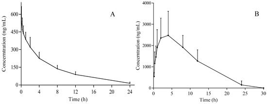 Plasma concentration–time plots of gomisin D after i.v. (A) and i.g. (B) administration.