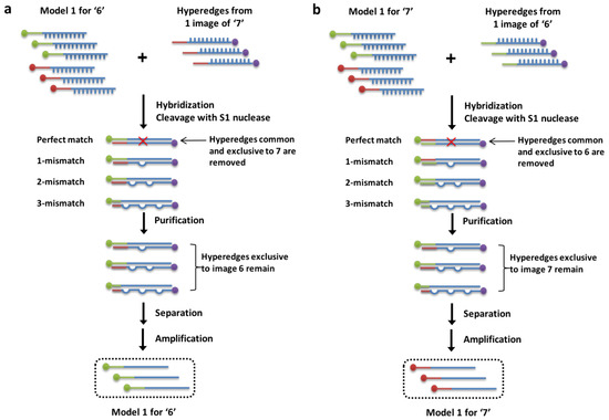 First, the training data for digits ‘6’ and ‘7’ is hybridized with the training data for ‘7’ (Figure 3a). Then, S1 nuclease, an enzyme which cleaves the perfectly matched DNA sequences (completely hybridized hyperedges) is added. This allows for the selection of only the perfectly matched hyperedges, leaving any degree of mismatched hyperedges in the tube. This is the enzymatic weight update operation that is demonstrated in vitro. DNA is then purified, separated using biotin, and amplified with PCR resulting in a mixture of single-stranded DNA hyperedges exclusive to ‘6’. This is repeated for the training data for ‘6’ to train ‘7’ (Figure 3b).