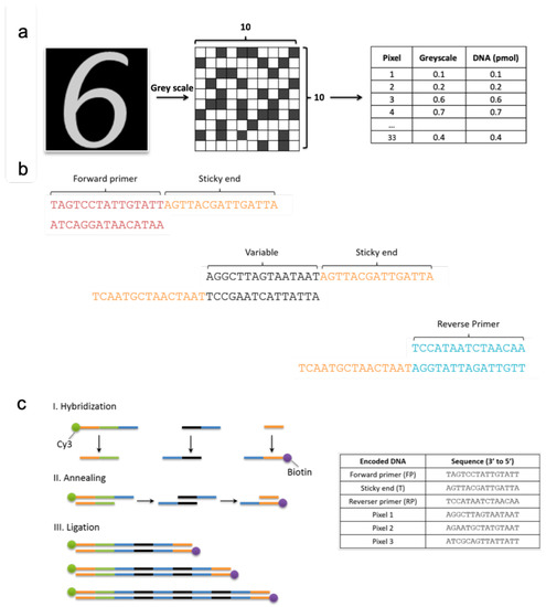 From each image 33 pixels are randomly selected in a non-replacement manner to form a hypernetwork model. 33 pixels were used as we wanted to use the least amount of pixels to represent the largest search space of 10 by 10 pixel images. In other words, only 33 pixels were used in each ensemble of each iteration. So 33 unique DNA sequences could be used to represent , so 99 pixels in total for each ensemble of learning. In our experiment, we produce three ensembles for each image (Figure 5). The 33 unique pixels from each ensemble are encoded to DNA by allocating 33 unique DNA sequences consisting of 15 base pairs each. Unique DNA oligomers are sequenced with an exhaustive DNA sequence design algorithm, EGNAS [40]. EGNAS, stands for Exhaustive Generation of Nucleic Acid Sequence, and is a software tool used to control both interstrand and intrastrand properties of DNA to generate sets with maximum number of sequence designs with defined properties such as the guanine-cytosine content. This tool is available online for noncommercial use at http://www.chm.tu-dresden.de/pc6/EGNAS. Once each DNA oligomer is assigned to a pixel, that is, one unique DNA to each pixel (Figure 4b), it is the grey scale value (between 0 and 1) for each pixel that determines the amount of DNA to be added to make the DNA dataset (Figure 4a). Each class is labeled with a different fluorescent protein to allow visualization of classes, allowing for the learning of two classes in one tube.
