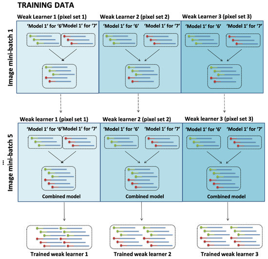 With the enzymatic weight update, through the decrease weight function of S1 nuclease, we eliminate the hyperedges common to both ‘6’ and ‘7’ resulting in only exclusive hyperedges characterizing ‘6’ and ‘7’ for successful digit classification. This corresponds to the negative weight update idea. The discrepancy between the two classes of digit data is represented by the remaining pool of DNA sequences, which are then added to one tube. The addition of the remaining sequences symbolizes the positive weight function. The trained hypernetwork from mini-batch 1 is added to the next minibatch and so on. Here the concept of online learning is applied. The weak learner 1, 2, 3 for ensembles 1, 2, and 3 respectively is added at each iteration to form the final trained weak learner after mini-batch 5 (Figure 5). The ensemble method is discussed in the next section. Repetition of these learning steps is predicted to construct an ensemble of three molecular classifiers which can be used for ensemble prediction in the test stage by measuring the final ratio of fluorescence for Cy3 (Label for 6) and Cy5 (Label for 7). To perform online learning, after the model is trained with each mini-batch, the DNA pool is combined to create a final hypernetwork model for given classification tasks.