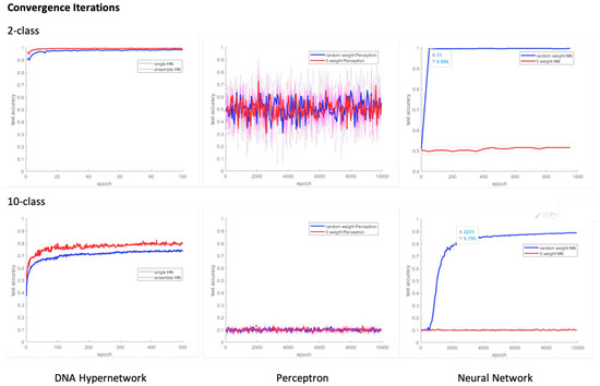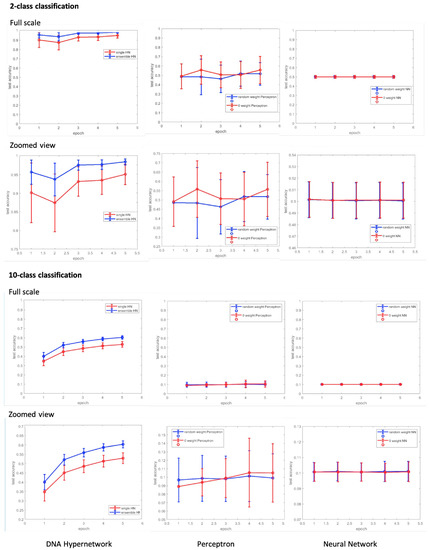 Figure 8 shows the results of our in silico classification results. As the number of epochs increased, the test accuracy of the hypernetwork also increased. The accuracy of the hypernetwork was also higher than the comparative models of the perceptron and neural network. We note here the significance of having used an accuracy measure to evaluate our classifier. The DNA learning models implemented in vitro in the mentioned related works often lacked appropriate measures to evaluate the classifier’s performance. Furthermore, though recognition abilities have been reported through in vitro molecular learning, classification of data through learning and testing this, to consequently group or label the unknown test data to a category by a molecular learning model is to the authors’ knowledge a novelty in itself.