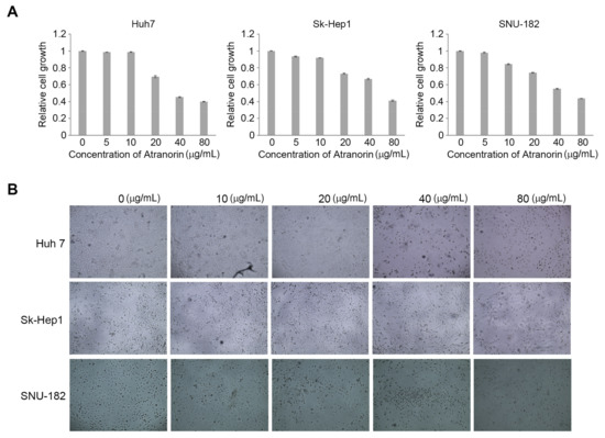 Atranorin inhibits cell growth in a dose-dependent manner. (A) MTT assay using HCC cell lines. The indicated cell lines were plated into 96 well pate and Atranorin was treated as shown in the figure for 24 h. Subsequently, the cell growth was measured by a standard MTT assay and the values were normalized by those of the non-treatment group. Bars represent ±SEM, and p-values were obtained by paired Student’s t-test (n = 3, p < 0.05). (B) Microscopic images of the HCC cells treated with Atranorin. The indicated cells were treated with Atranorin for 24 h followed by monitoring the changed number of cells and morphology under light microscope.