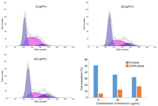 Cell cycle progression is closely related to cell growth, tightly regulated by cyclin-dependent kinases (CDKs). The somatic mutations on the cyclins and CDK genes are frequently observed in cancers. Consequently, the failure of the regulation in cell cycle machinery generally drives cancer progression [14]. To avoid unwanted mitogen messaging caused by mutations on the CDKs and cyclin genes, we tried to select cells harboring wild type alleles of those genes. According to the data set in Cancer Cell Line Encyclopedia (CCLE), no mutation in CDKs and cyclins is found in SK-Hep1, Huh-7 and SNU-182 HCC cell lines. Therefore, we decided to analyze the cell cycle progression with HCC cell lines harboring the wild type in Atranorin-induced cell growth inhibition. We investigated the ability of the cell cycle in SK-Hep1 cells treated with different concentrations of Atranorin (0–40 μg/mL) by analyzing the amount of DNA contents with propidium iodide (PI) staining. As shown in Figure 2, we found that a lower number of the cells treated with Atranorin were significantly stocked in S phase, which consequently increased the number of cells in G2/M phase (Figure 3). These data suggest that Atranorin treatment evoked G2/M phase cell cycle arrest. Furthermore, our observation that the number of cells going through S phase was reduced suggests that Atranorin could induce G1 phase cell cycle arrest, as well as G2-M phase.