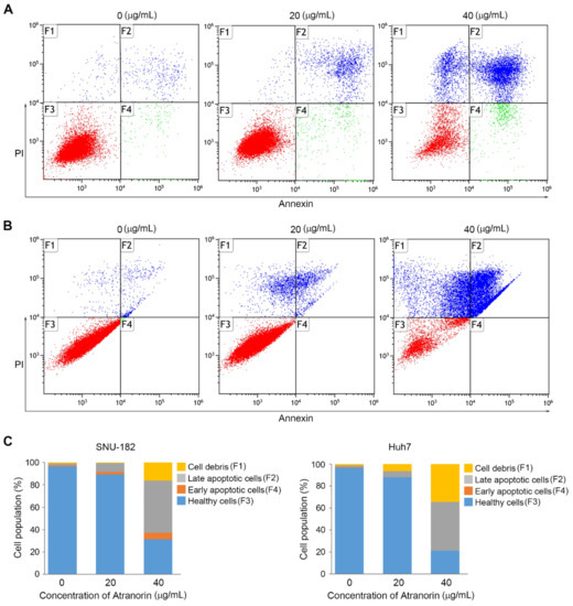 Atranorin treatment sensitizing HCCs. (A,B) the analysis of apoptotic events in the SNU-182 (A) or Huh-7 (B) cells. The cells were incubated with Atranorin for 24 h as shown in the figure. Subsequently, the samples were treated with annexin-V and Propidium Iodide (PI) followed by counting the positive events under FACS. The quadruplicated plot representing early apoptosis (annexin-V+ and PI-), late apoptosis and/or necrosis (annexin-V+/- and PI+), respectively. (C) The summarized analysis of the apoptotic events enforced by Atranorin in SNU-182 (left panel) and Huh-7 (right panel).