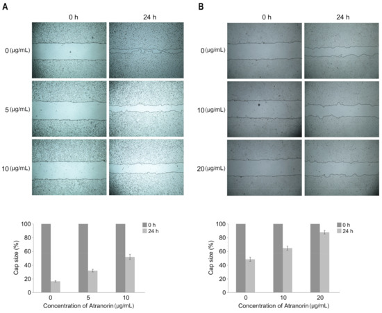 The overall experimental procedures were conducted following the manufacturer’s protocol (Calbiochem). Briefly, the cells were placed into 6-well plates and were subsequently placed in the reduced serum medium (1% FBS) for 16 h. After that, the cells were treated with Atranorin as shown in the figure followed by placement in a migration or invasion chamber. Additionally, the complete media containing 10% FBS was added into lower chamber, which could be used as a chemoattractant. After 24–48 h, the migrated and invasive cells were stained using a Cell Stain Solution (400 μL) and were photographed.
