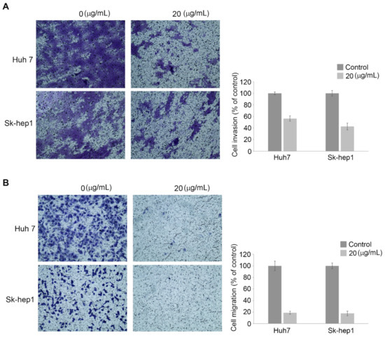 The Sk-Hep1 and Huh-7 cells were plated in a 100-mm dish, and wound-healing ability was subsequently addressed by a scratch assay. As a result, we found that Atranorin treatment significantly inhibited the healing ability (Figure 5A,B). Interestingly, we previously showed Atranorin did not show any inhibitory effect in cell proliferation at a low dose (Figure 2) suppressing cell wound-healing ability. These observations suggest that wound-healing suppression by Atranorin is likely to be mediated by suppressing cell migration. Therefore, we investigated whether the natural drug could also suppress cell migration and invasion by employing specific chambers. As shown in Figure 6, the SK-Hep1 and Huh-7 cells were incubated with Atranorin for 24 h followed by placing a migration or an invasion chamber for an additional 24 h. As a result, the migratory and invasive effects of the cells were suppressed upon Atranorin treatment (Figure 6A,B). Taken together, here we are claiming that a Lichen-derived secondary metabolite, Atranorin suppressed the oncogenic potential of HCC by suppressing cell proliferation, migration and invasion capacities, which provides insight into anti-cancer therapeutics against HCC by providing functional evidence.