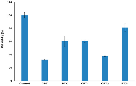 The antiproliferative activity of camptothecin (CPT), paclitaxel (PTX), and their conjugates at (5 µM) concentration in MCF-7 cells after 72 h incubation.