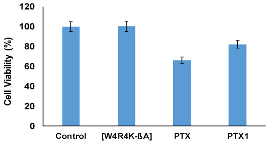 Our previous studies revealed that [W(WR)4K(βAla)] did not show any significant cytotoxicity up to 10 µM on MDA-MB-468, HCT-116, CCRF-CEM, and SK-OV-3 [21,25,26]. Herein, the antiproliferative activity of conjugate was evaluated in the presence of the human breast adenocarcinoma (MCF-7) cells. Among breast cancer cells, MCF-7 ones were selected to be tested for this assay due to their significant response to microtubule-targeting drugs [42,43].