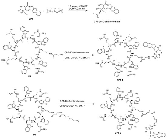 Similarly, CPT was conjugated to the [W(WR)4K(βAla)] (P1) through an amide bond. Initially, CPT with a C20-chloroformate functional group was prepared by the treatment of CPT with triphosgene in the presence of DMAP. CPT-20-O-chloroformate was conjugated with P1 through two different approaches; the first approach was through the pH-labile carbonate bridge, which bound directly to the free β-alanyl amino group of the cyclic peptide in DMF using a catalytic amount of DIPEA, as depicted in Scheme 3, to afford carbamate conjugate CPT1. The second approach depends on the reductive-cleavage for the disulfide bridge and hydrolysis of carbonate linkage (the dual response approach) in compound CPT2. Compound P3 was reacted with CPT-20-O-chloroformate in the presence of DIPEA to afford CPT2. It was expected that in the second approach, the disulfide bridge in ([W(WR)4K(βAla)-S-S-CPT] would be cleaved via reduction of the disulfide bridge by the intracellular glutathione (GSH). Whereas, the concentration of GSH in the tumor tissue is 4 times higher than that of the normal tissues [40]. Darwish et al. [41] have previously reported the impact of a disulfide bridge in increasing the cytotoxic activity of Dox conjugated to [C(WR)4K] when investigated in HEK-293, HT-1080, and SKOV-3 cells as compared to Dox after 72 h incubation. The mechanism affording the thiol-containing CPT followed by the carbonate bond cleavage liberating thiazolidinone and CPT and five-membered thiolactam was demonstrated by Henne et al. and Zhang et al. [39,40].