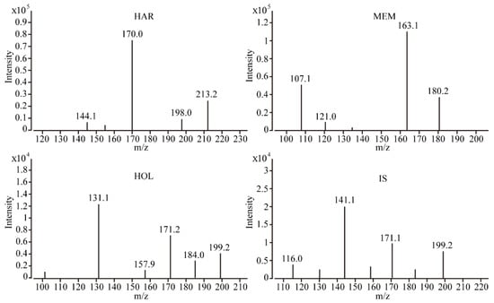 The optimization of UPLC-MS/MS conditions was done by infusing the standard solutions of MEM, HAR, HOL and IS directly into the electrospray ionization (ESI) source. The signal intensities of analytes and IS were higher and more stable when positive ESI mode was selected. The precursor and product ions of analytes and IS were selected in positive mode. The most sensitive multiple reaction monitoring (MRM) transitions used for HAR, MEM, HOL and IS were 213.2/170.0, 180.2/163.1, 199.2/131.1 and 199.2/144.1, respectively. The product ion mass spectra of HAR, MEM, HOL and IS are shown in Figure 2. MS specific optimized critical parameters of analytes and IS which ascertain reproducible responses were tabulated in Supplementary materials Table S1. Methanol was used as the organic phase because it provided higher responses and lower background noise than acetonitrile. The sensitivity and peak symmetry of analytes and IS were remarkably improved by adding 0.1% formic acid to the mobile phase.
