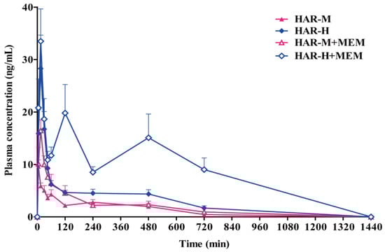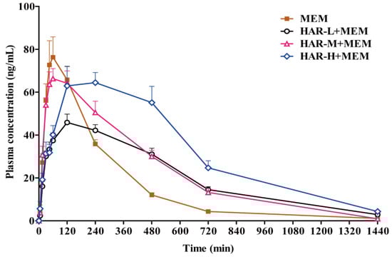 Mean plasma concentration time curves of MEM in rats plasma after single administration of MEM at a dose of 5.0 mg/kg and oral administration of low (20.0 mg/kg), medium (40.0 mg/kg) and high (80.0 mg/kg) doses of HAR combined with MEM (5.0 mg/kg) (n = 8, mean ± SEM).