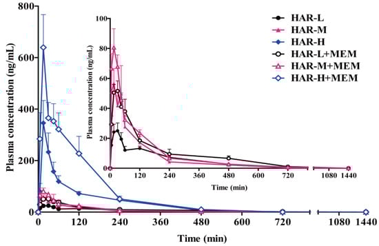 Mean plasma concentration time curves of HAR in rats plasma after oral administration of low (20.0 mg/kg), medium (40.0 mg/kg) and high (80.0 mg/kg) doses of HAR and low (20.0 mg/kg), medium (40.0 mg/kg) and high (80.0 mg/kg) doses of HAR combined with MEM (5.0 mg/kg) (n = 8, mean ± SEM).