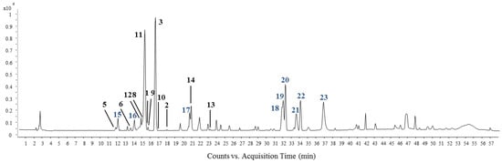 Total ion chromatogram of HJF by HPLC-ESI-qTOF-MS/MS in the negative ion mode. Peak assignments with isolated (1–14) and predicted (15–23) compounds.