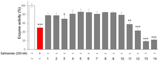 We tested the MAO B inhibitory activities of 14 isolated compounds (20 μM) isolated from H. japonicus. Safinamide, a reversible MAO B inhibitor, was used as a positive control in the experiment [30]. DMSO was used as a control group to exclude the influence of the solvent. As shown in Figure 4, isolated compounds 12, 13, and 14 namely vitexin, apigenin and luteolin at 20 µM exhibited the greatest inhibition of MAO B, with enzyme inhibitory activities ranging from 58% to 79%, while compounds 3 and 11 showed weak inhibitory activities compared to the control group.