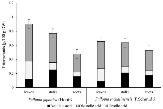 Content of triterpenoids (g/100 g DW) in wild Fallopia japonica (Houtt) and Fallopia sachalinensis (F. Schmidt) leaves, stalks, and roots.