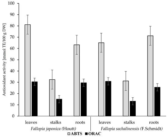 Antioxidative activity determined with in vitro assays: ABTS and ORAC, in wild Fallopia japonica (Houtt) and Fallopia sachalinensis (F. Schmidt) leaves, stalks, and roots (mmol TE/100 g DW).