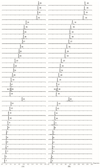 UHPLC-MS-MS chromatograms of mixed standards (A) and sample (B) for the 35 analytes in this study. The analytes numbers 1–35 are consistent with those in Table 1.