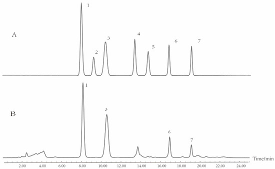 Similarly, for the analysis of mono-oligosaccharides in T. kirilowii, according to literatures [26,31], water/acetonitrile was chosen as the preferred mobile phase, and gradient elution was applied during the liquid chromatography process. The typical chromatograms of mono-oligosaccharides and sample S1 (Wanlou 7) are presented in Figure 2.