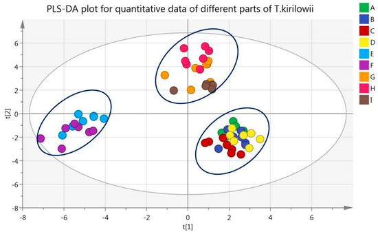 PLS-DA plot of T. kirilowii samples. main root (A), lateral root (B), lateral root bark (C), main root bark (D), stem (E), leaf (F), pericarp (G), fruit pulp (H) and seed kernels (I).