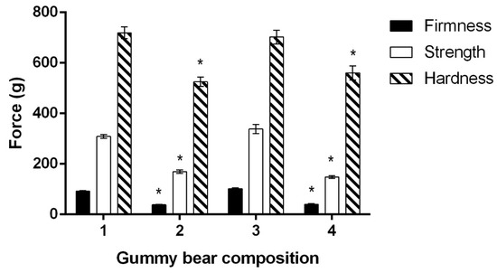 Figure 2). There were no statistical differences in firmness, strength, and hardness observed between composition No. 1 and No. 3, which was the same for No. 2 and No. 4. Therefore, we can conclude that the acai berry extract did not affect the textural properties of the gummy bear composition; however, other researchers have suggested that the influence of acai berry on the textural properties and even moisture loss during storage may depend on acai berry processing [