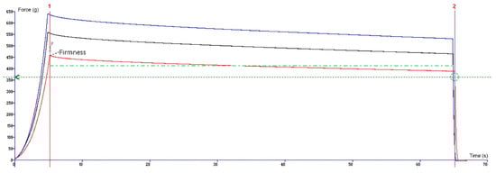 For the compression test, an analytical probe p100 was forced down onto each gummy bear sample at a defined rate (1 mm/s) with a trigger force of 5.0 g using a load of 5 kg to measure the compression force (firmness). Once the trigger force was attained, the probe proceeded to compress the sample to 20% of its original height. It was held at this distance for 60 seconds and then withdrew from the sample to its starting position. The bellow plot illustrates a force-time (or distance) curve, which shows the characteristics of gum firmness and springiness (