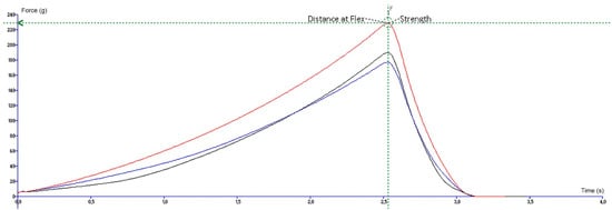 A flexibility test using a miniature three-point bend rig (HDP/M3PB) specialized the stress area and stain height parameters so the correct stress and stain could be displayed on the graph axis and the result of the compression and penetration test could be easily rendered. The two adaptable supports for the plate of the rig base were built a suitable distance aside in order to provide the required support for the investigated sample. The distance between the supports was measured and kept constant throughout the experiment. Then, the base plate was fastened to the heavy duty platform. The heavy duty platform was set in the right position if and when the distance between the blade and the two adaptable supports was equal. Further on, the sample was situated in the middle of the supports. The probe was forced down into each gummy bear at 2 mm/s to a depth of 15.0 mm with an automatic trigger force using a load of 5 kg. After the trigger force was reached, the value of force increased and the product started to bend. The gummy bear’s resistance to bending was expressed as the highest point of force. The value of force is associated with the strength of the sample. The measure of a distance at which the force peak is achieved emphasizes the degree of deformation that needs to be applied to the gummy before bending fully commences and specifies flexibility. The experiment was carried out three times, and the obtained results are given as the mean with standard deviation. The graphical view is presented in
