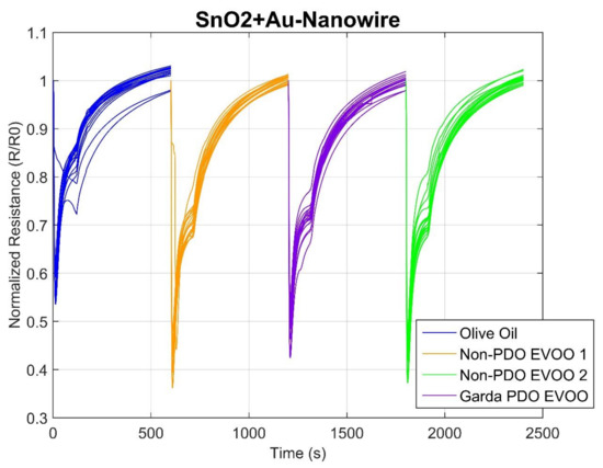 Once the data were acquired, sensor responses were checked for the measurements of each session. Moreover, the response curves for the given olive oil samples obtained from the individual sensor were studied to observe and detect any relevant features. This step allowed us to eliminate the sensors whose response did not yield useful information. In Figure 1, it is possible to see a typical response of a n-type MOX sensor; in this case, normalized resistance variation of a SnO2+Au nanowire is shown. Normalization of the signals has been performed computing the ratio between the first value of resistance recorded and all the values of the same measure. For this reason, all signals start from a value equal to 1. Sensors responses are grouped based on their belonging to one of the 4 samples analyzed in the first phase: olive oil, non-PDO EVOOs and Garda PDO EVOO. Furthermore, signals are shown in sequence along the time axis; since each measurement lasts 600 s, time ranges from 0 s to 2400 s.
