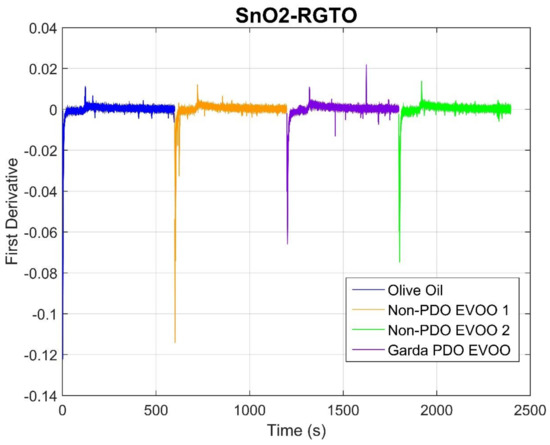 Then, the first derivative of the signal over time was considered. The first derivative can give information regarding the speed at which the resistance varies over time, which is an index of the speed of the reaction that take place over sensing layers. Indeed, since different oils are characterized by different numbers and amounts of VOCs, and sensors have different affinity toward them, it is plausible to think that the maximum speed of resistance change can be used as a marker for different oil typologies. In Figure 2, the first derivatives of SnO2 RGTO sensor are shown. The sequence representation of the signals follows the same logic described for Figure 1. In this case, the maximum speed is the minimum (negative) value, since derivatives were calculated using finite differences, a method widely used to approximate numerical derivatives.