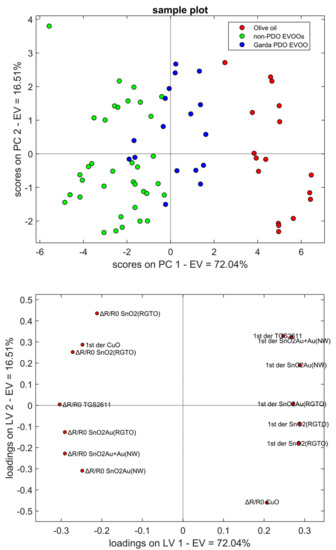 To evaluate which of the 14 features (7 sensors × 2 types of features) were suitable for the task, Principal Component Analysis (PCA) was performed. In Figure 3, score (top) and loading (bottom) plots are shown; the total explained variance was equal to 88.55%. A clear distinction between the olive oil sample (red circles) and the EVOOs can be noticed. On the contrary, there is a partial overlap between the Garda PDO (blue cluster) and the other two EVOOs (in green). This result could mainly be due to different production processes that distinguish a regular olive oil from an extra virgin one, but also to the different cultivar composition of the analyzed samples. Consequently, the number and amount of the VOCs differ from sample to sample, leading to dissimilar responses of the sensors. However, the use of sensors that respond in a similar way are redundant, since they provide the same information. For this reason, some of them are discarded. Dimension reduction of the dataset was done through the analysis of loadings. Starting from 14 parameters, 7 were not considered for the following analysis, since they gave the same contribution to the first two principal components (PCs). The remaining features were ΔR/R0 values of two SnO2-RGTO, SnO2Au-RGTO, CuO, SnO2Au-NW and the minimum of 1st derivative of SnO2-RGTO and SnO2Au+Au-NW.