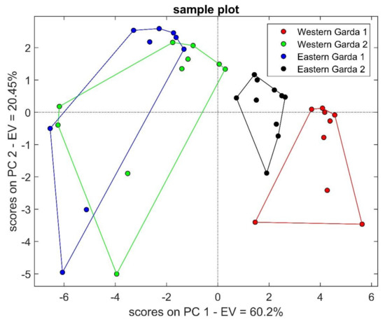 Once the system was tested and we had noted that it was able to distinguish three different types of oil with a good accuracy, we tried to evaluate whether S3 was able to distinguish among two different PDO EVOOs. Four different Garda products were considered; from here on, they are called Western Garda and Eastern Garda. The same steps were used as in the first phase of data analysis. PCA in Figure 4 shows the separation between the two different lake shore EVOOs (red and black clusters), while the other two seem to be more similar, since they are partially overlapped (blue and green groups). The total explained variance is equal to 80.65% in the first two PCs.