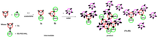 During the formation of F1-F5 DCFs (Figure 1), the process was monitored by 1H-NMR, when the ratio between TA and SQ-PEG-NH2 in the first step was 1:1, and, as a consequence, the appearance of intermediates Ia and Ib was clearly observed (Figure 2).